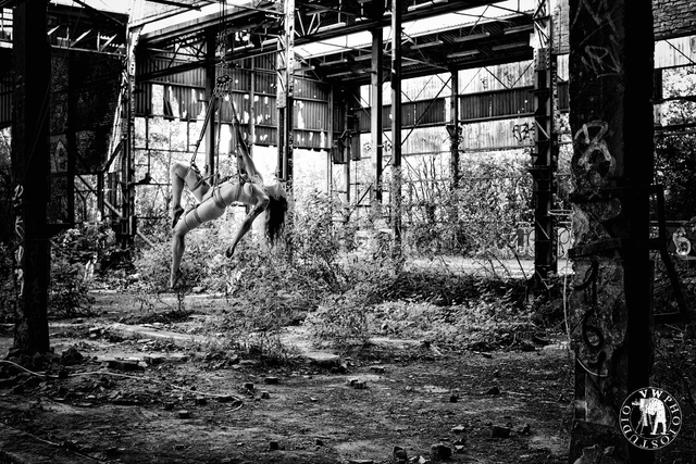 Tirage Fine Art sur Alu-Dibond au format 30x45cm , intitulé "Danse aérienne" , une suspension shibari réalisée dans un urbex industriel.